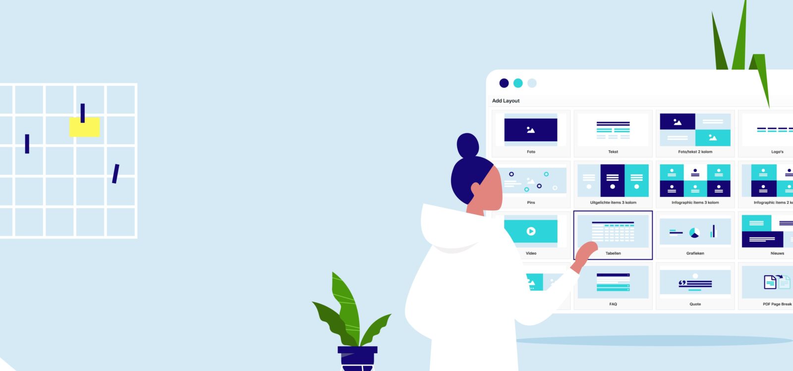 Onder het tabblad ‘pagina’s’ worden al je pagina’s verzameld en ingericht. Je vult deze pagina’s aan de hand van contentblokken. Maak je bijvoorbeeld een grafiek of tabel (via de andere tabbladen), dan voeg je deze in je publicatie via een pagina (aan de hand van contentblokken). Zodra je klaar bent met een pagina kun je deze aan je publicatie toevoegen via het tabblad ‘instellingen’ > ‘pagina indeling’.