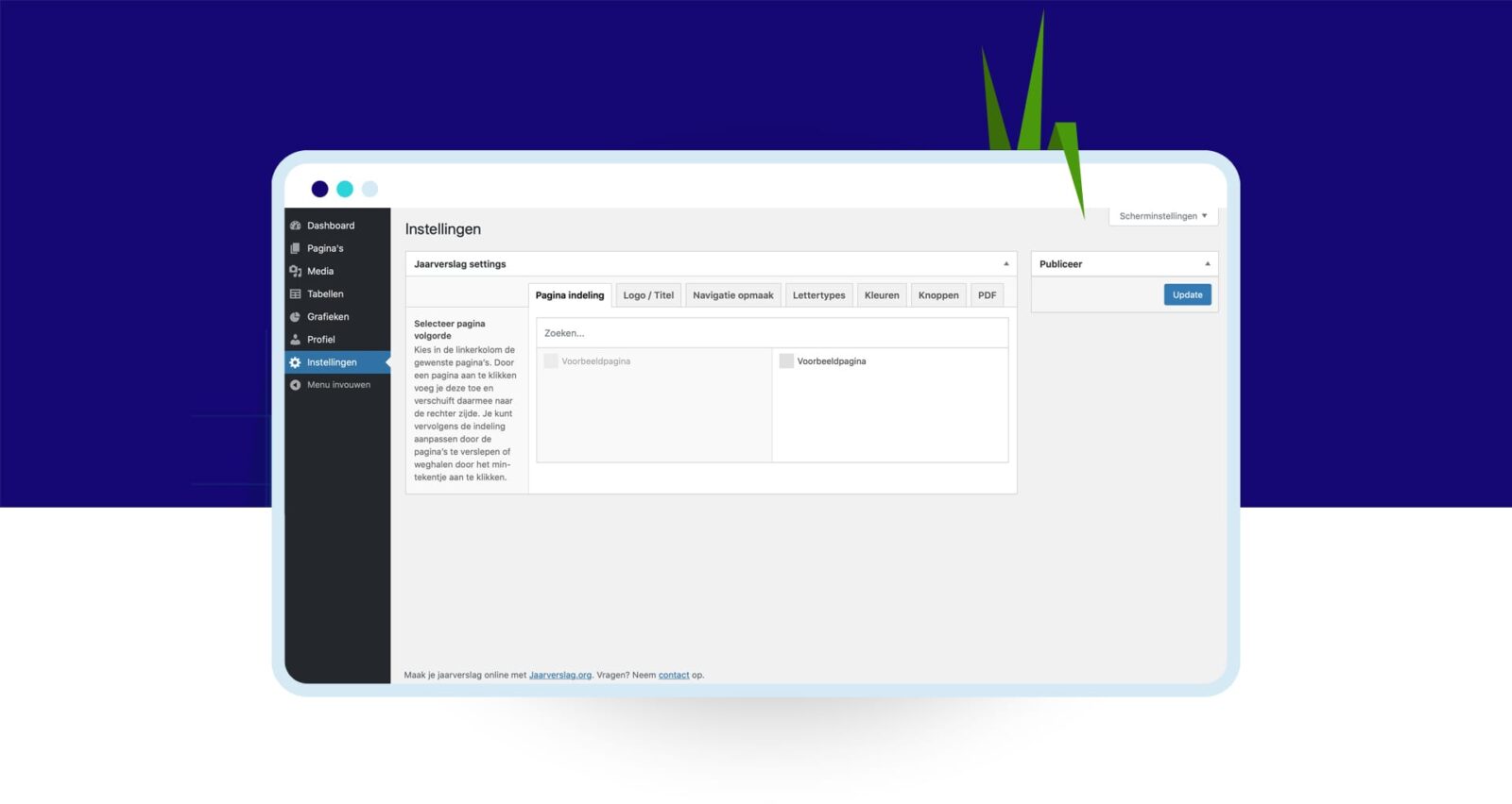 Hier vind je de algemene instellingen van het jaarverslag. Zo kun je de publicatie titel instellen en bepalen welke pagina de voorpagina is. Hier kun je instellen hoe afgerond de hoeken van de knoppen in de publicatie moeten zijn. Je bepaalt de hoeveelheid witruimte tussen de contentblokken op zowel desktop, tablet als of mobiel. En hier kun je een pictogram uploaden (icoon dat bovenaan de pagina wordt getoond naast de url).
